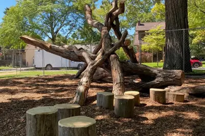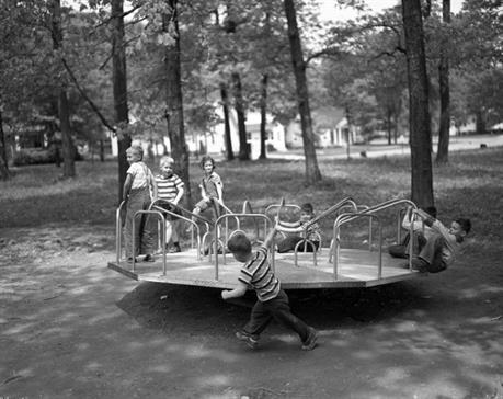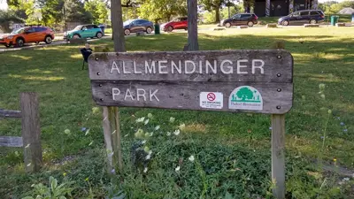Allmendinger Park is an 8-acre park located on Pauline Boulevard between Hutchins and Edgewood Avenue, southwest of downtown. View the Ann Arbor Parks and Natural Areas map for location context. It has a mix of open spaces and oak woods. The park contains softball fields, a restroom facility (closed in winter) and water fountain, a play area nestled in an oak and hickory grove, picnic tables, a tennis court and a basketball court. An asphalt path connects the play area, picnic area and restroom facility. In the spring, lilacs along the southwest edge bloom. Many people come here to fly kites, run with their dogs, chase their kids around the baseball diamonds, practice martial arts and picnic. The kids playground makes a good birthday spot and provides plenty of shade. A favorite feature of the playground is the classic merry go round.